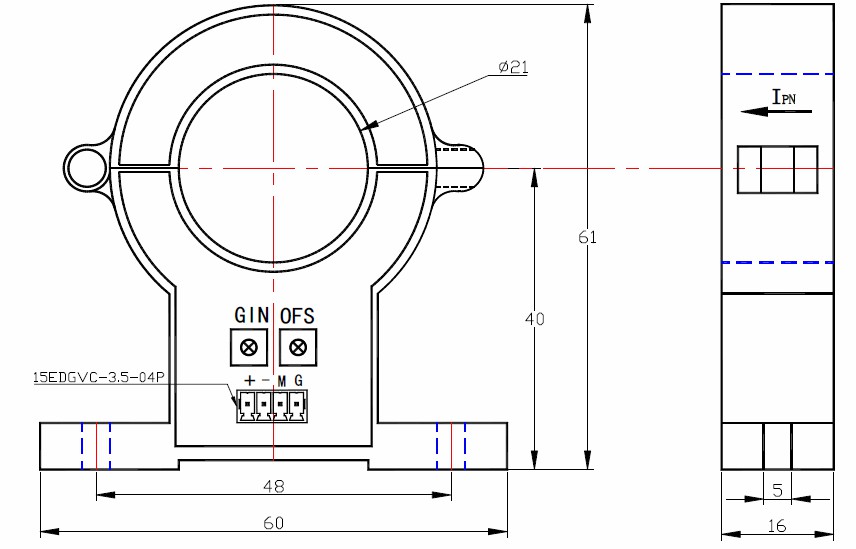 该传感器采用直测式霍尔检测原理工作。原边电流产生的磁通量聚集在磁电路中,并由霍尔器件检测出霍尔电压信号,经过放大器放大,该电压信号精准的反应原边电流。
